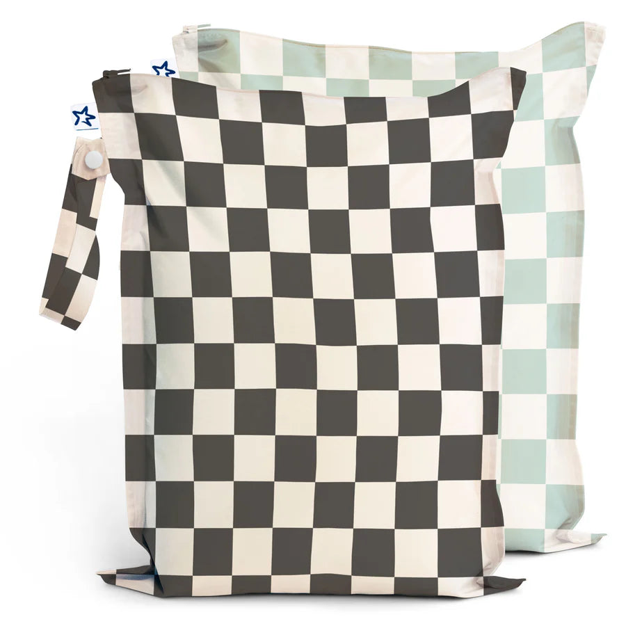 Tiny Twinkle Mess-proof Wet Bags are made from soft, lightweight, waterproof polyester that comes from 100% recycled plastic. These roomy bags are sized at 12.5x16 inches (32x40 cm) and are easy to carry or store in your larger diaper bag, hand bag or suitcase. The side strap handle easily attaches to strollers or allows for hanging storage anywhere. The heat-sealed seams make these Wet Bags perfect for storing messy or wet items when you are traveling!
