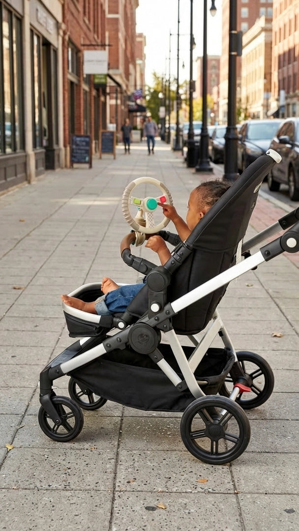 One minute they’re doing tummy time, the next they’re hitting the road. The Bitzy Driver turns everyday errands into a joyride for your little speed racer. With three built-in fidgets (rocker switch, rotating wheel, and joystick) and a pivoting steering wheel, little one will be focused on the road so you can focus on your to-do list. Clip it to your stroller, wagon or shopping cart, ask baby to pass you the aux and relax. They’ve got the rest. 𝐅𝐞𝐚𝐭𝐮𝐫𝐞𝐬 • Travel = playtime with this spinning steering wheel made for little racers • Three built-in fidgets keep baby busy while you do you • Adjustable clip fits most strollers, wagons and shopping carts. Versatile and adorable.